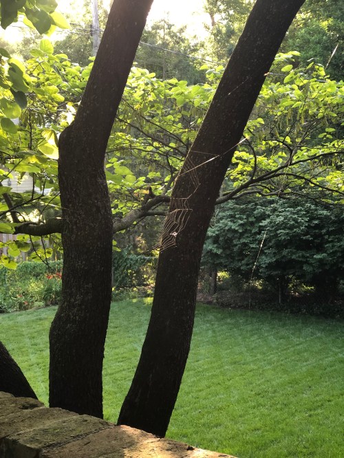 Spider webs are fascinating to me. Not just the full blown catching-my-dinner webs but even the transport line webs – the single strands that catch sunlight and flip through your periphery. Sometimes you see only a portion of a web, sometimes you see just the reflected sunlight. A whisper of delight rustling and dancing in the breeze. The merest mention of presence. They remind me that there are infrequently visible harp strings all around.