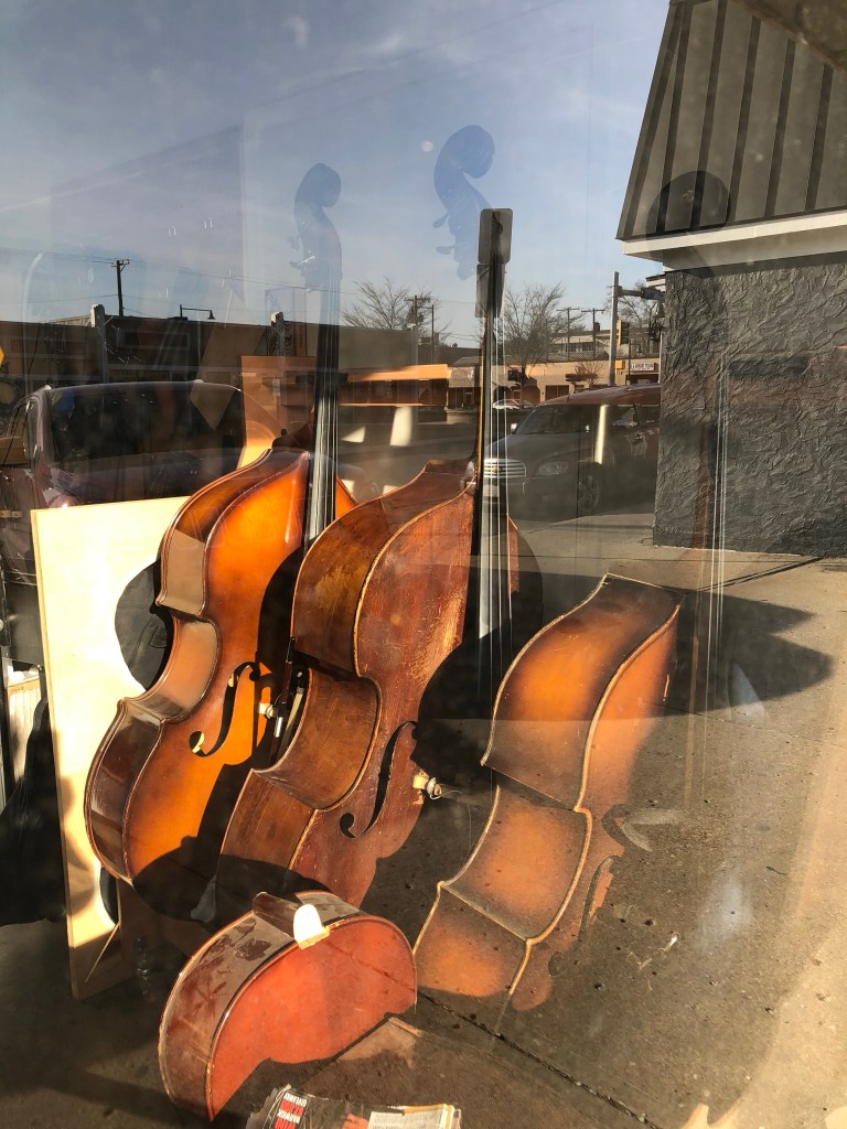 There they were in the window of the repair shop we pass on our way to church. Silent sentries waiting to be called back to duty. I love the curve of these basses, and the clear “usage” marks. Looking out over the cars and people with donuts from the donut shop two doors down, they wait.