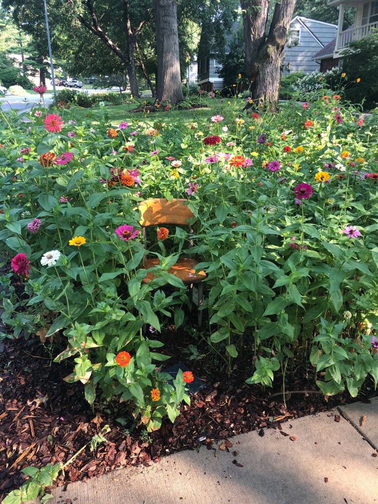 Occasionally, they put a small kindergarten size chair in amongst the flowers. I’ve never seen anyone actually sit on it but it is fun to imagine, especially, a small child sitting amongst the flowers laughing at almost but not quite being hidden in a secret place. A place of beauty to watch the world go by.
