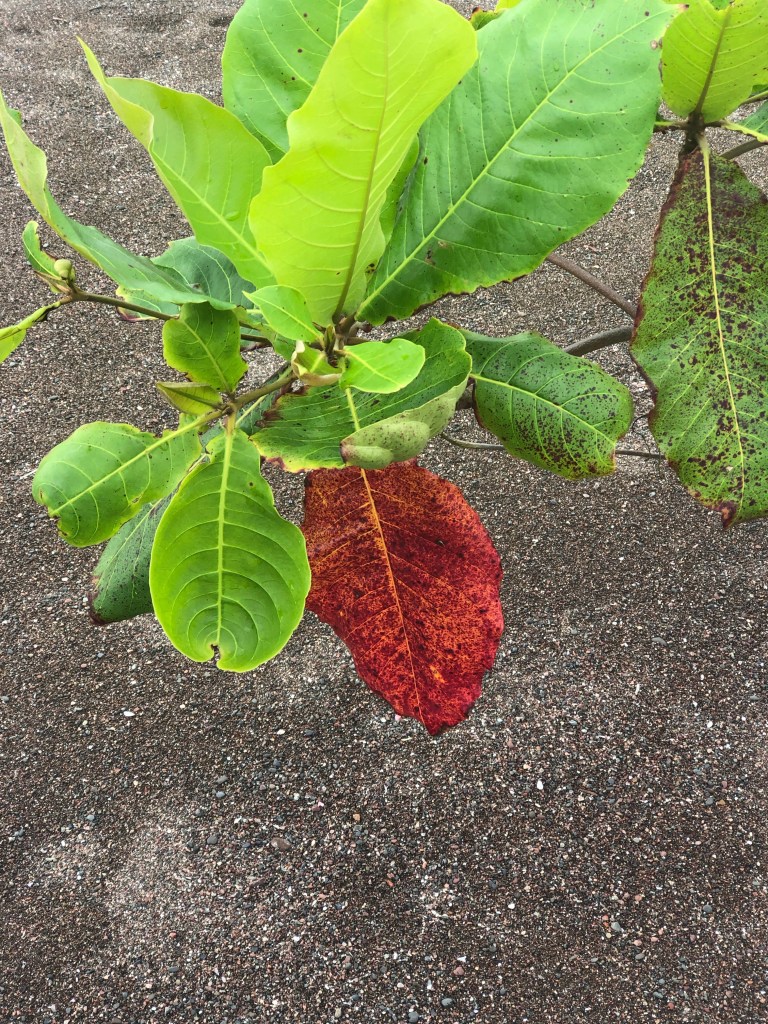Every leaf on this sea almond sapling is different. In all sorts of ways: color, age, size, wholeness, shapes, diseased or not, and so on.