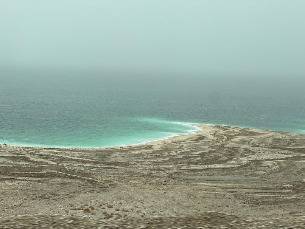 When we first saw it from the highway, it was beautiful! Once the weather cleared you could see clear across it to Israel. We were staying at a hotel right on the edge of the Dead Sea, so we swim-suited up and headed down to the edge. The small beach area was covered in pebbles and rocks. There was no icky smell, and the water was beautifully clear.