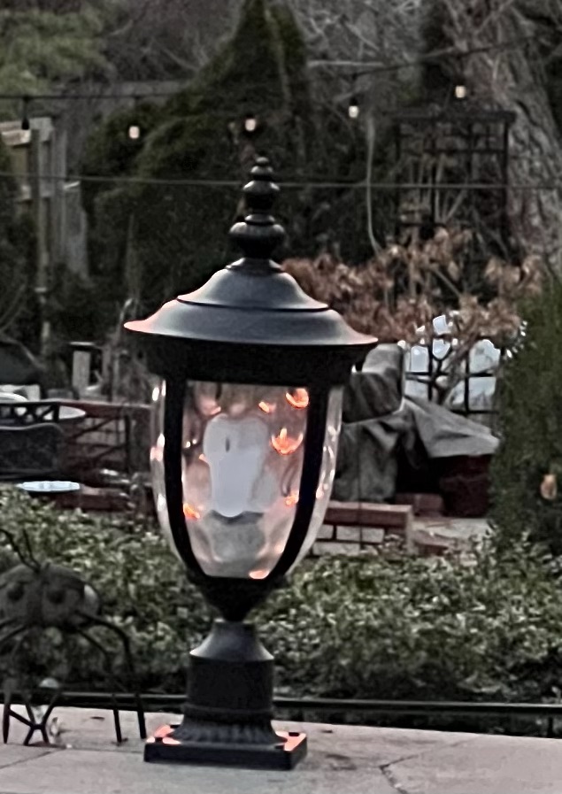 One morning I noticed the odd lighting in our patio lamp. It looked as if fire were actually trying to escape from inside it.